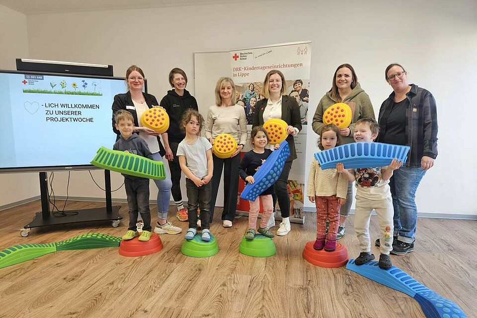 „Die Kinder können anhand von verschiedenen Aufgabenstellungen ihre Konzentrationsfähigkeit üben, das ist ein zentrales Ziel der Workshops“, erläutert Reinhard Stükerjürgen. Zum Wochenauftakt unter dem Motto Bewegung und Koordination wird zunächst die Bedeutung von Bewegung für die verschiedenen Bildungsbereiche betont. „Das Denken in alle Richtungen, in die Zukunft und die Vergangenheit gerichtet, aber auch schon beim Plus- und Minus-Rechnen, funktioniert wesentlich besser, wenn wir auch geübt haben, den Körper in alle Richtungen zu bewegen“, erläutert Nina Marhofen, die den ersten Workshop durchführt. Auch Martina Grün, Kita-Fachberaterin bei der DRK-Jugendhilfe und Familienförderung in Lippe, ist begeistert: „Kinder erforschen ihre Welt aktiv, und gerade dieses aktive Experimentieren, das in den Workshops ermöglicht wird, spricht alle Altersgruppen an, das beginnt schon bei den U3-Kindern.“